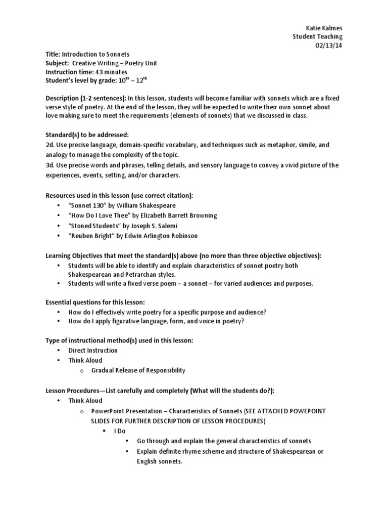 Kalmes Lesson Plan Sonnets Sonnets Poetic Devices